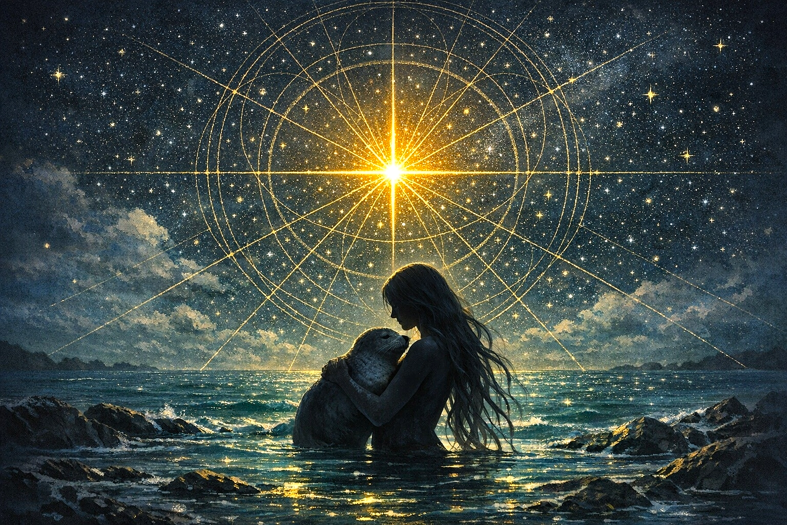 サビアンシンボル「海から上がった女性をアザラシが抱きとめる」